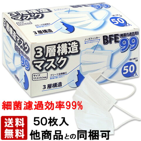 フェイスマスク100枚 マスク 三層構造 50枚入り*2箱セット (100枚!!) MASK PM2.5 花粉 細菌 衛生 ウイルス ガード ふつうサイズ BFE 99%カット